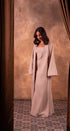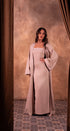 An elegant Moroccan caftan in a soft nude pink hue.